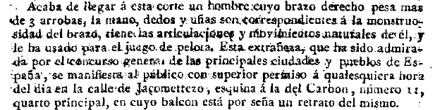 En 1815 tenemos constancia de un pelotari cuyo descomunal brazo era objeto de exhibición al público, previo pago de una entrada. Constituía una verdadera atracción.