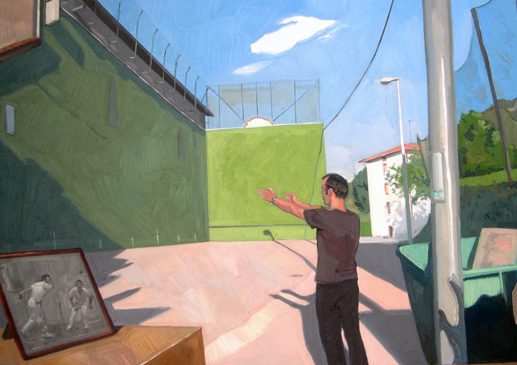 Mientras preparaba la exposición sobre frontones, decidí atribuir a cada cuadro un pintor y a cada pintor una jugada, su jugada específica; a Sisley un besagain, a Hopper un dos paredes, a Renoir una escapada, a Monet un gancho de zurda… El día que pinté el frontón de Askizu, ahora cubierto, cayó una granizada terrible. Había una luz especial, era un día muy oscuro. Decidí llamarlo Jeu de Paume.