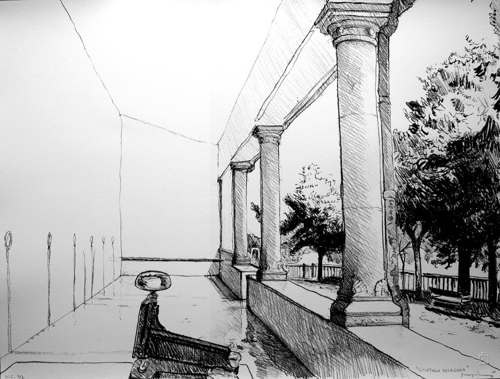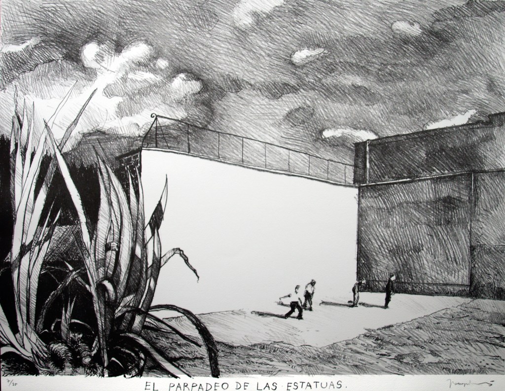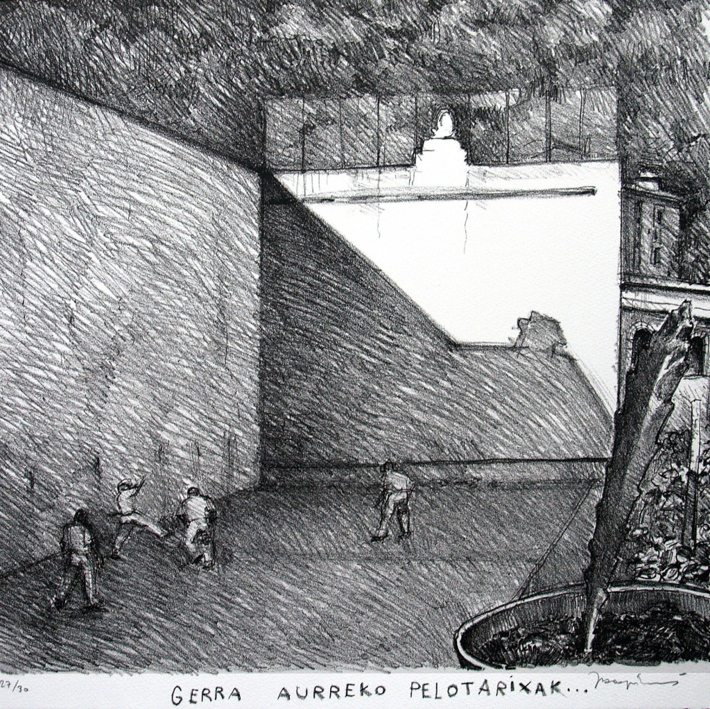 Enamora su serie en la que dedica y homenajea a un renombrado pintor, relacionándolo con un frontón y una jugada. Reproducimos (con su permiso, por supuesto) la entrevista que le hizo Isabel Vidarte (www.pelotamano.com), en la que el autor con sus palabras, nos recuerda a las disquisiciones de Jorge Oteiza, relacionando con clarividencia espacio/frontón/arte/pelota.